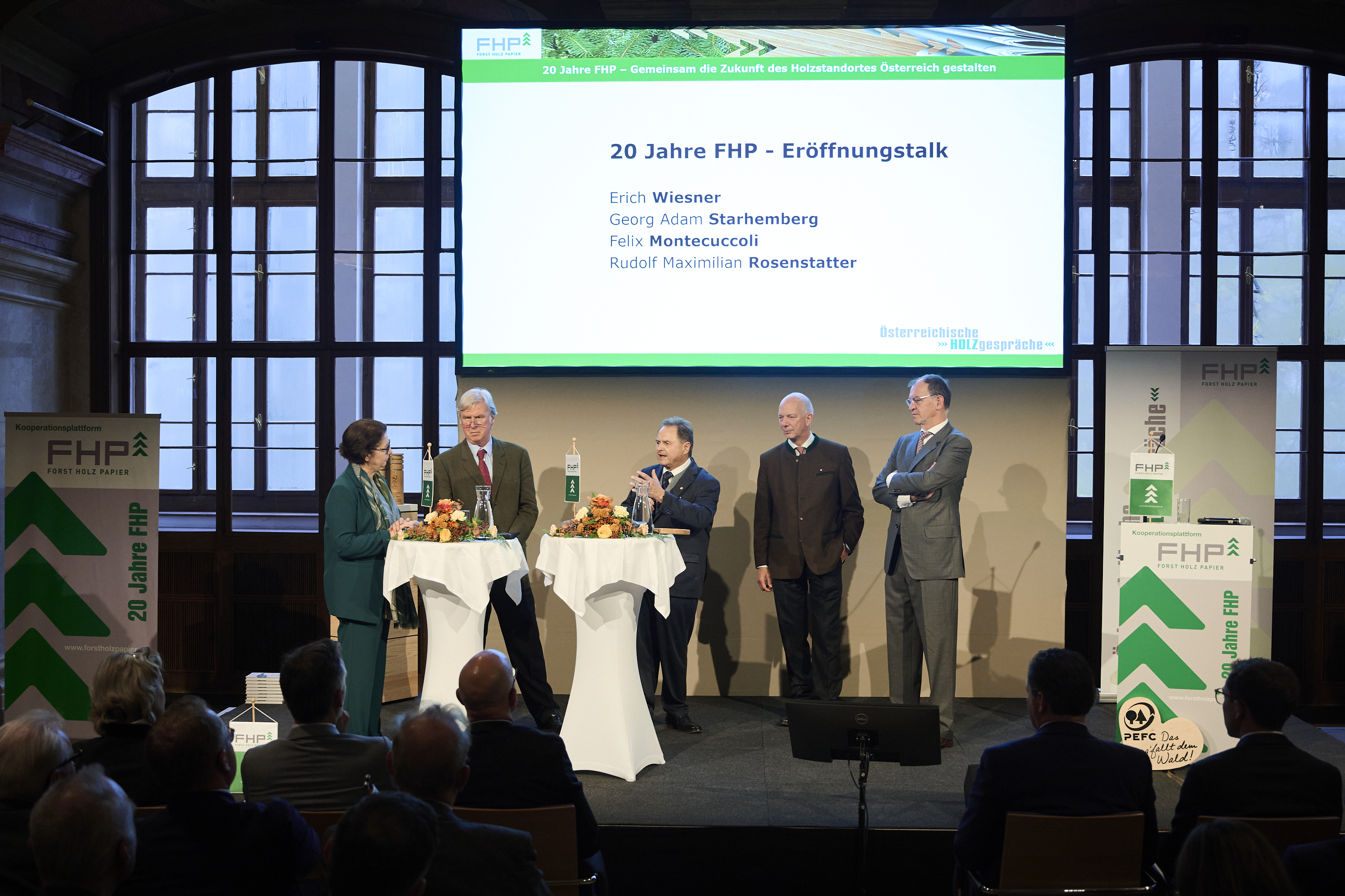 Unter dem Motto „20 Jahre FHP – Gemeinsam die Zukunft des Holzstandortes Österreich gestalten“ fanden am 13. November 2025 die Österreichischen Holzgespräche der Kooperationsplattform Forst Holz Papier (FHP) im Palais Niederösterreich in Wien statt. Nach der Eröffnung durch FHP-Vorsitzenden Erich Wiesner richtete Bundesminister Norbert Totschnig seine Grußworte an die rund 250 anwesenden Gäste. Im Rahmen eines Eröffnungstalks blickten die ehemaligen FHP-Vorsitzenden Georg Adam Starhemberg, Felix Montecuccoli und Rudolf Maximilian Rosenstatter gemeinsam mit Wiesner auf zwei Jahrzehnte erfolgreicher Zusammenarbeit in der Holzbranche zurück. Dabei standen die Gründung der Plattform sowie die langjährige Kooperation innerhalb der Wertschöpfungskette Holz im Mittelpunkt. Mit ihren Fachvorträgen beleuchteten WIFO-Direktor Gabriel Felbermayr und Alexander Brenneis (Eisenberger Rechtsanwälte) die wirtschaftlichen Chancen und politischen Herausforderungen der Holzwirtschaft und zeigten auf, welche Voraussetzungen für nachhaltiges Wachstum und Wettbewerbsfähigkeit notwendig sind. Im Zentrum der Veranstaltung standen das 20-jährige Jubiläum, die Zukunft des Holzstandortes Österreich sowie die Vorsitzübergabe an Konrad Mylius für die kommenden zwei Jahre.