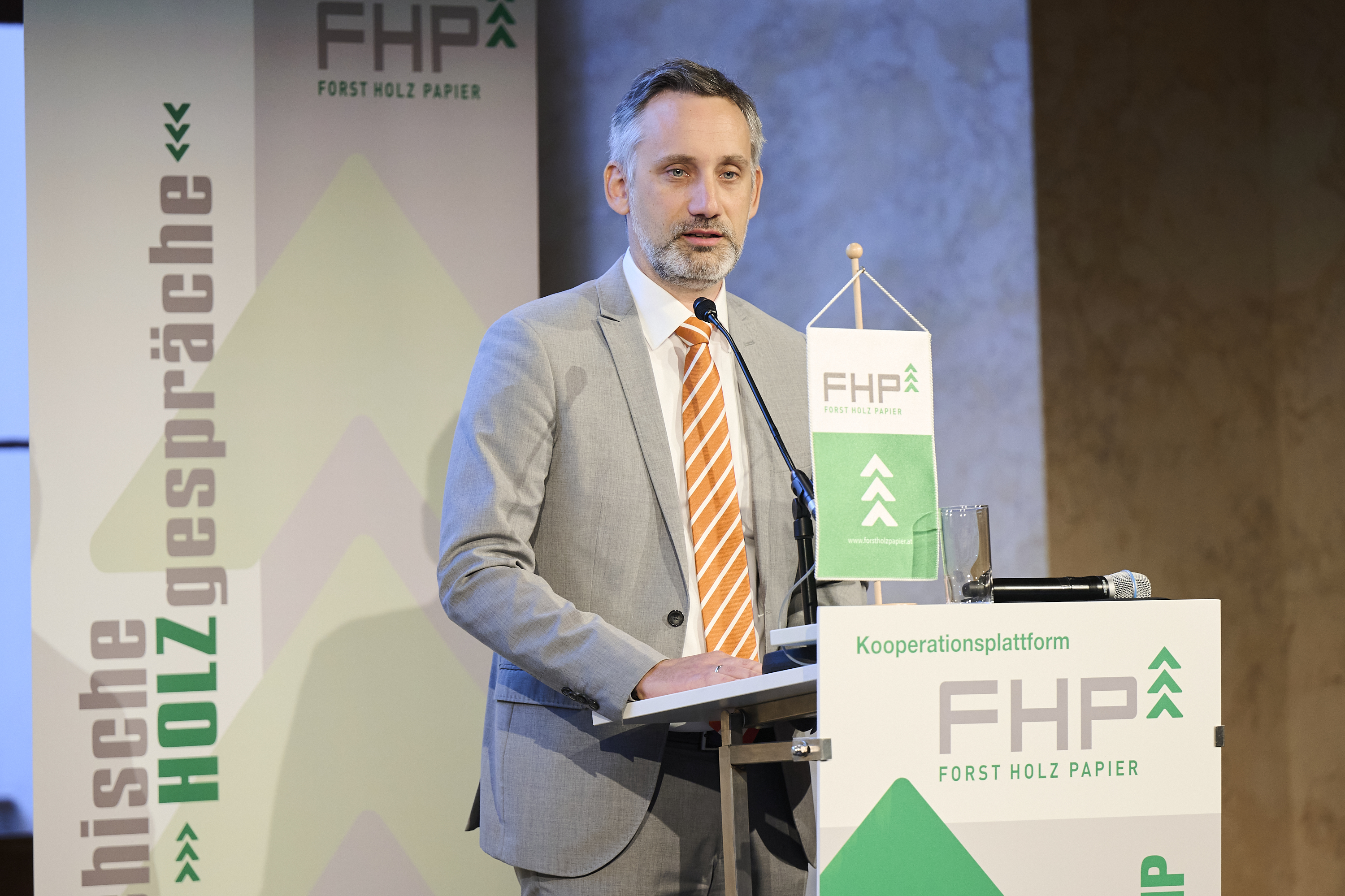 Bundesminister Norbert Totschnig betonte in seiner Rede die Bedeutung eines starken Zusammenhalts in der Holzbranche und würdigte das Engagement von FHP für eine nachhaltige Wertschöpfung sowie den konstanten Einsatz für den Holzstandort Österreich. „Die Kooperationsplattform FHP ist seit nun schon 20 Jahren eine wichtige Stimme für den Holzstandort Österreich. Gerade auf EU-Ebene ist es entscheidend, dass die Branche geschlossen auftritt, wenn politische Weichen für den Holzsektor gestellt werden. Holz leistet einen zentralen Beitrag zum Klimaschutz, zur regionalen Wertschöpfung, zur wirtschaftlichen Stabilität sowie zur Weiterentwicklung der Wirtschaft hin zur Bioökonomie und damit zur positiven Entwicklung unseres Landes“, so Norbert Totschnig, Bundesminister für Land- und Forstwirtschaft, Klima und Umweltschutz, Regionen und Wasserwirtschaft.